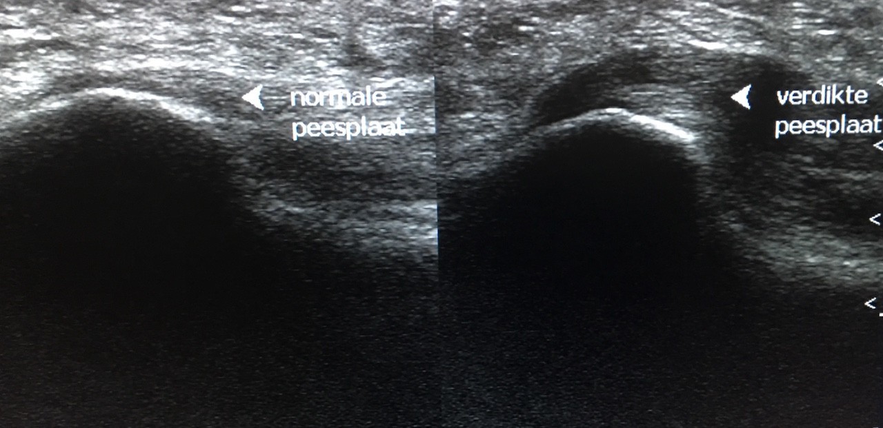 Sinds een jaar of tien geleden echografie zijn intrede deed binnen de fysiotherapie kon deze platte peesplaat zelf ook bekeken worden en al snel bleek dat het niet de hielspoor (het aangroeisel) maar de overbelaste en verdikte platte peesplaat was die de hielpijn veroorzaakte. Sommige zorgverleners zijn daar niet van op de hoogte en noemen de hielpijn nog altijd ‘hielspoor’, terwijl het in feite om een peesplaatontsteking (fasciitis plantaris) gaat.